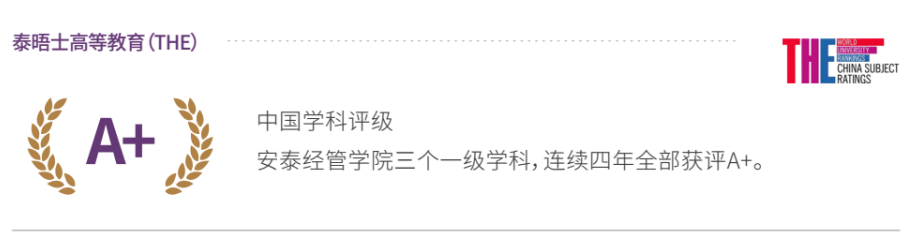 学院在国内外各类学科排名中成绩卓越。在全球最具影响力大学排名之一的英国QS“2023年世界大学学科排名”中,星空彩票app免费下载安泰经济与管理学院相关的四个学科,全部进入全球60强。其中会计与金融位列全球第39名、商业与管理位列全球第32名、统计与运筹位列全球第43名、经济学与计量经济学位列全球第56名。在教育部最新的学科评估排名中,学院的工商管理学科获评A+,管理科学与工程学科获评A+,应用经济学获评A。在教育部第二轮“双一流”学科建设名单中,我院工商管理学科再度入选。