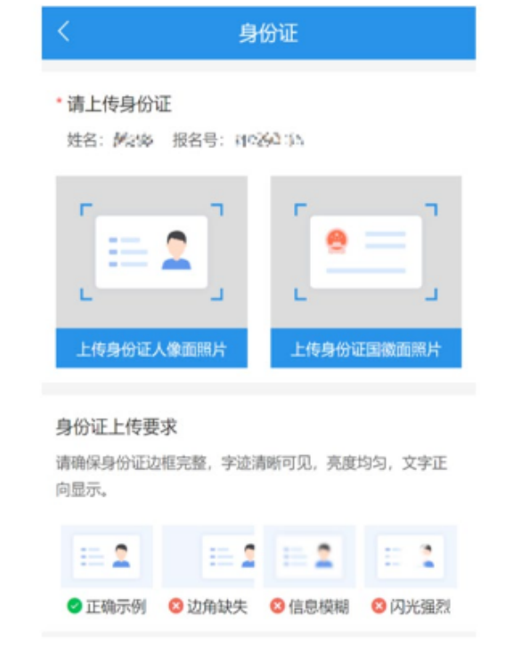 因身份证核验未通过等情况,系统显示“有效证件照片必传”的考生须在确认系统内上传本人有效期内居民身份证原件正(人像面)反(国徽面)面照片,照片要求身份证边框完整,字迹清晰可见,亮度均匀。照片示例见下图:
